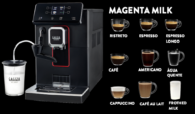 Кавомашина з італійським корінням Gaggia Magenta Milk Black RI8701/01 (Гаджіа Маджента Мілк) – автоматична побутова кавоварка з автоматичним приготуванням еспресо та напоїв з молоком. Панель керування з кольоровим дисплеєм та сенсорними кнопками забезпечує більший контроль та наочність функціоналу для покращення взаємодії з користувачем. Приготування напоїв надзвичайно просте, а всі процедури очищення автоматизовані. В меню передбачено приготування 9 видів напоїв. Задля підлаштування міцності напоїв кавомолка має 5 ступенів помелу та функцію «оптіарома», яка дає 5 варіантів кількості меленої кави на порцію. Підставка для чашок задля довготривалості виконана з нержавіючої сталі. Автокапучинатор конструкції CAPPinCUP дає можливість отримати збите у піну молоко на рівні професійної кавомашини та готувати напої з молоком у один дотик. Попереднє заварювання, яке передбачає паузу між першою подачею води у блок заварювання та самим приготуванням, дозволяє краще розкрити смак зерен.