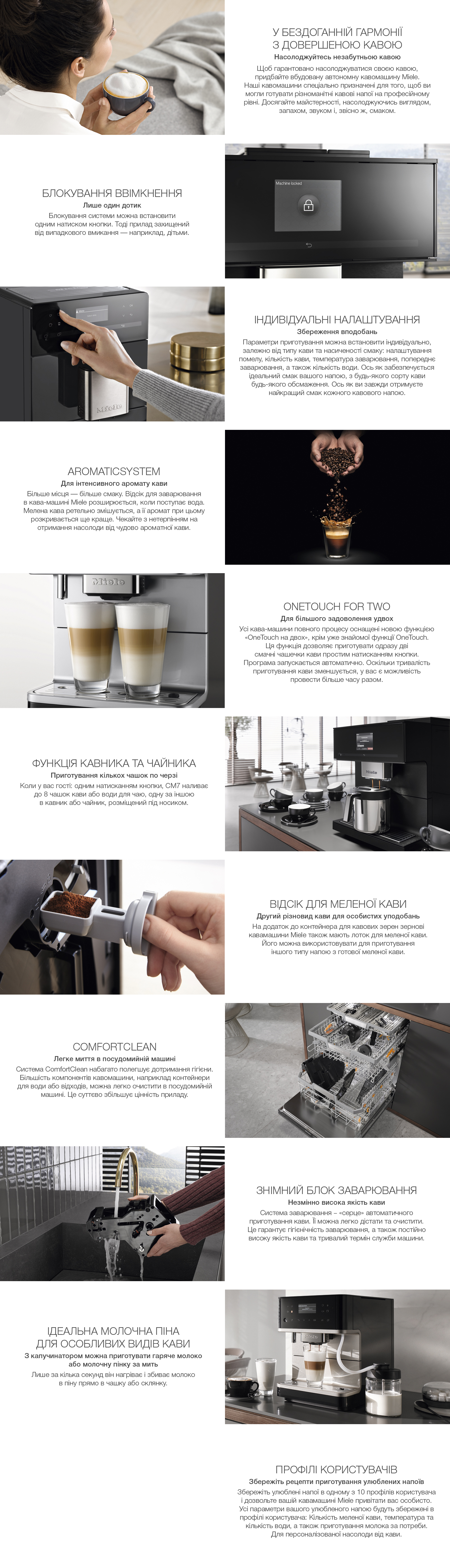 Ця кавоварка обладнана інноваційною технологією OneTouch, яка дозволяє приготувати еспресо або капучино всього за кілька секунд. З автоматичним очищенням та налаштуванням сили кави ви зможете насолоджуватися напоєм за вашим смаком без жодних зусиль. Модель MIELE CM 5510 також оснащена інтегрованою системою приготування молока, що забезпечує кремову текстуру для ваших улюблених напоїв.